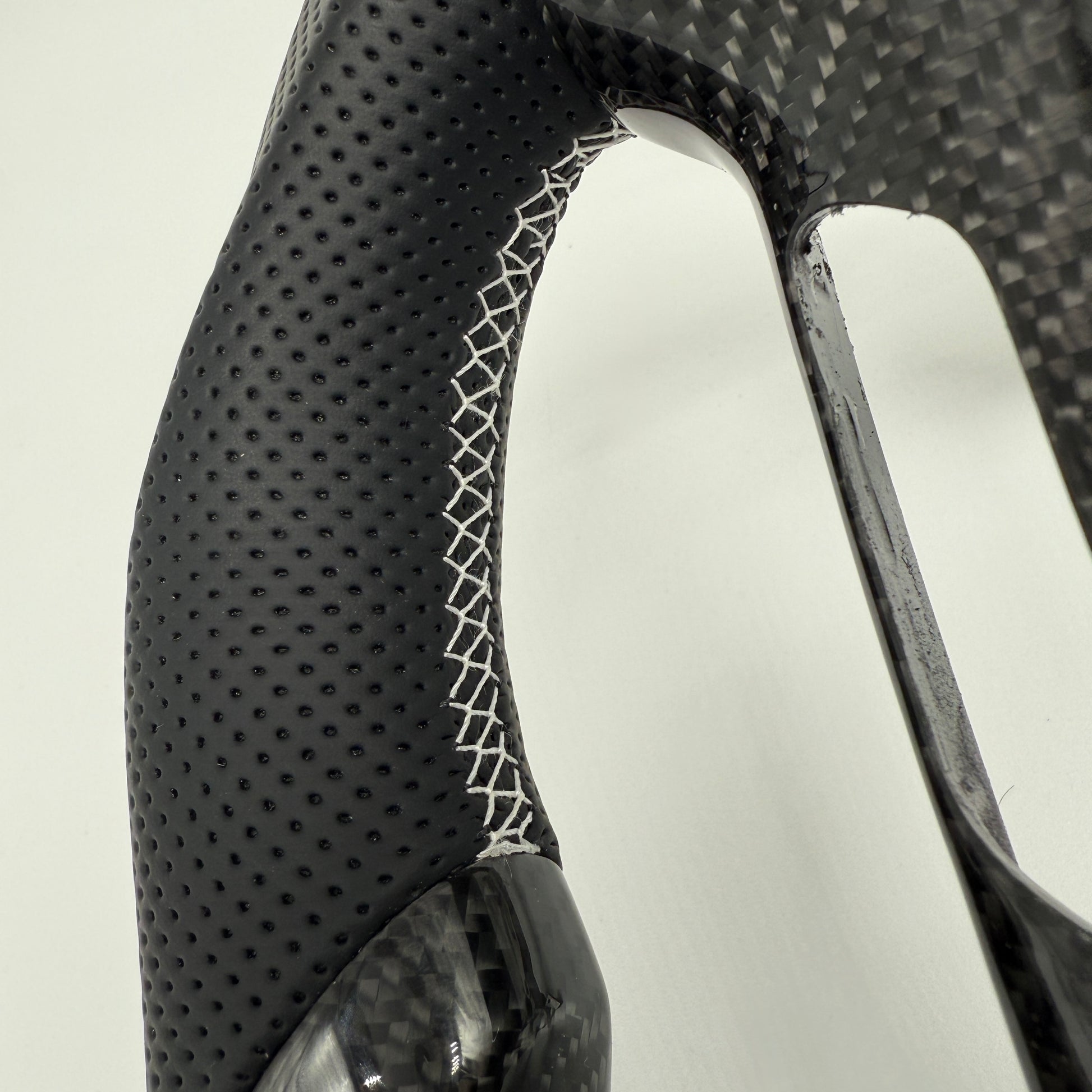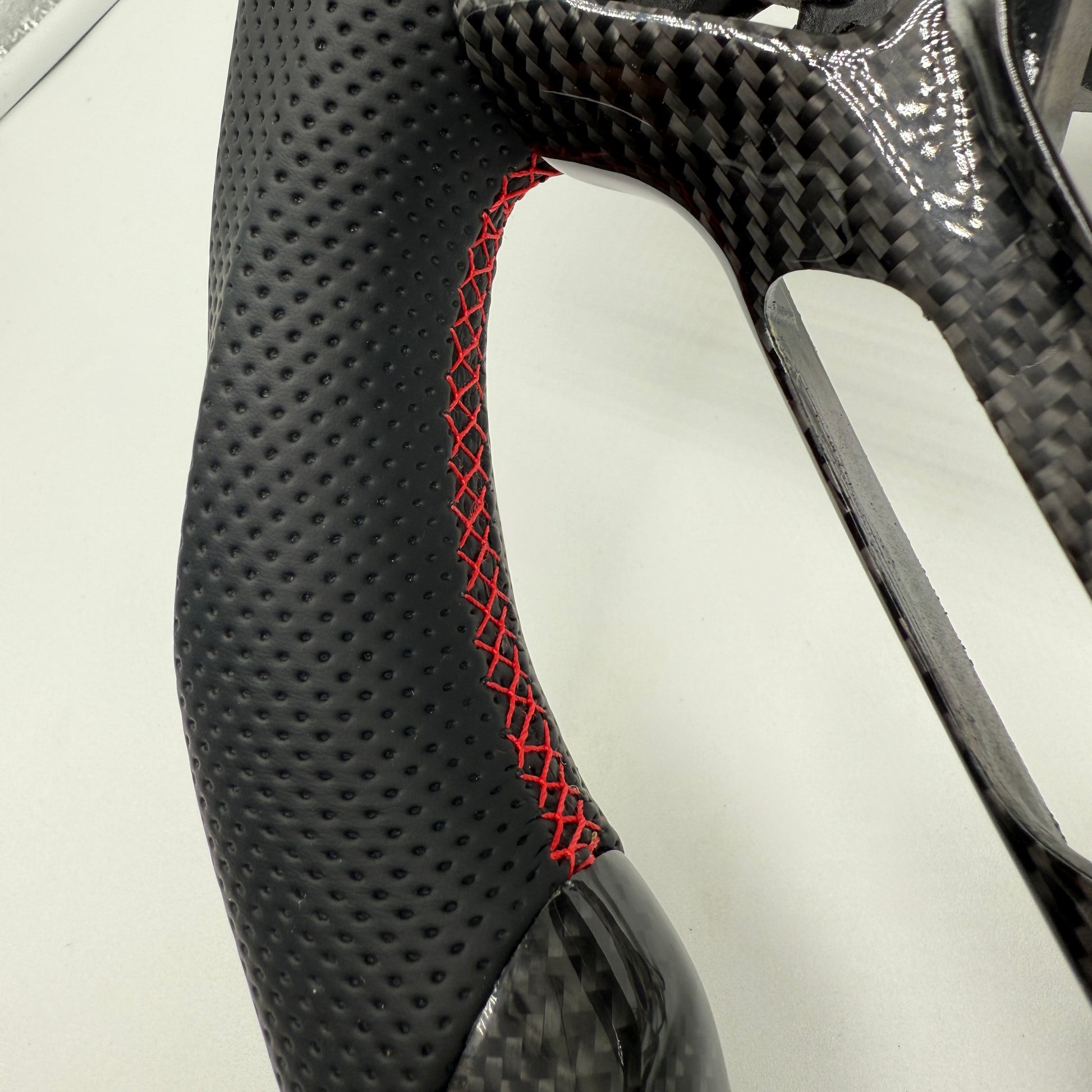 Perforated leather hand grips with red accent stitching